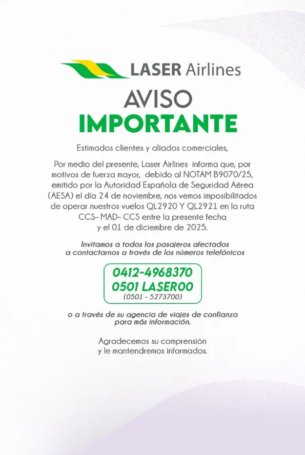 Laser Airlines informó que, debido al NOTAM emitido por la Autoridad Española de Seguridad Aérea (AESA), se ve imposibilitada de operar los vuelos: