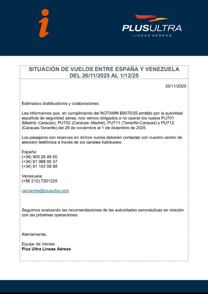 Plus Ultra informó que, debido al NOTAM emitido por la Autoridad Española de Seguridad Aérea (AESA), se ve imposibilitada de operar los vuelos: