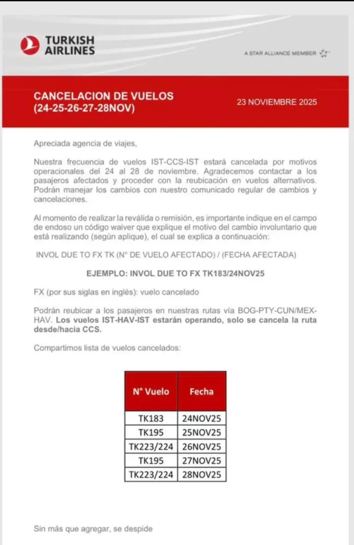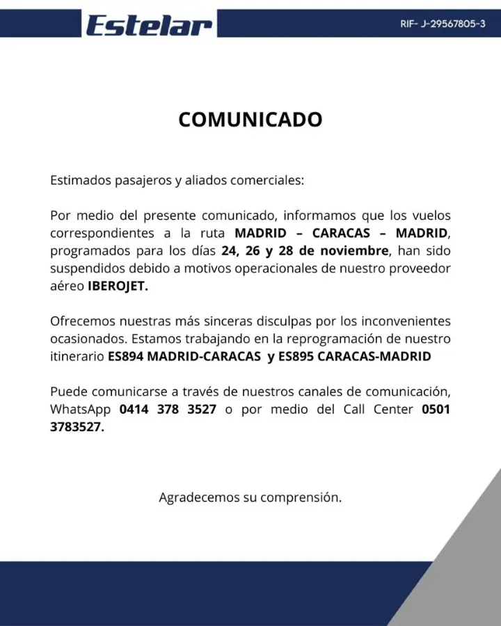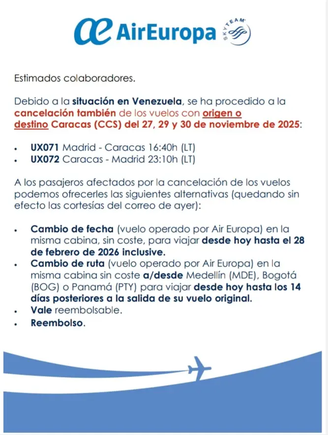 Air Europa anunció la cancelación de sus vuelos desde y hacia Caracas (CCS) correspondientes a los días 27, 29 y 30 de noviembre de 2025, específicamente: