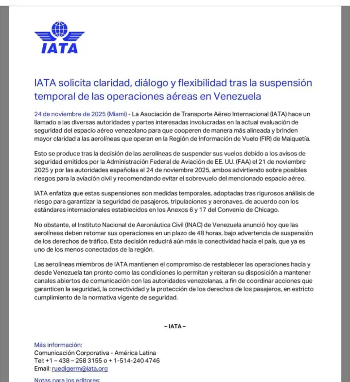 Estas decisiones afectan significativamente la conectividad internacional de Venezuela, especialmente en rutas hacia Europa. Aunque se espera que la suspensión sea temporal, el llamado de IATA sugiere la necesidad de una coordinación más estrecha entre organismos reguladores y aerolíneas para garantizar operaciones seguras, continuas y transparentes.